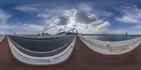 a fisheye view of the city by the water and the bridge on the other side of it