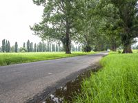This stock photo features a picturesque scene from the Bega Valley in the South Coast region of Australia. The image shows an asphalt road surrounded by lush green grass, with water puddles and trees lining the side of the street. The sunlight creates a beautiful play of light and shadow on the road surface, highlighting the vibrant vegetation and leaves. The rural landscape of Bega Valley, New South Wales, offers a serene and tranquil atmosphere, perfect for any nature or travel-related project.