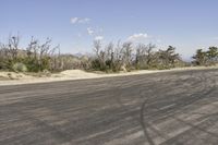 This photo captures a scenic view of an asphalt road in California, USA. The road stretches through a mountainous area, surrounded by vast land with sandy deserts and lush grass. It is a sunny day with a clear sky, making the landscape appear rugged yet beautiful. The road surface is smooth and well-maintained, enhancing the infrastructure in this natural environment. Trees line the roadside, adding to the picturesque scenery. This image showcases the unique charm of Angel Crest Highway, exemplifying the harmonious coexistence of nature and human-made structures. A perfect illustration of a road surrounded by breathtaking beauty.