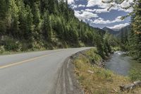A scenic view of a winding asphalt road surrounded by mountains and forests in British Columbia, Canada. The road surface reflects the clear blue sky and lush vegetation. Explore the stunning landscapes of Lillooet and discover the magnificent larch trees.