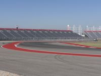 A road made of smooth asphalt, winding through a clear sky day. Its curve leads to a grand stadium, surrounded by a race track with fixed-link structures. The perfect setting for thrilling racing events.