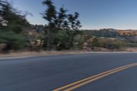This image captures the serene beauty of a mountainous landscape as a person rides on the back of a motorcycle along an empty road. The clear sky and the dawn light create a stunning backdrop for the scene. The road, made of asphalt and tar, winds through the hills and vegetation. Majestic trees line the road, complementing the natural beauty of the surroundings. This photo represents the freedom and tranquility of exploring the outdoors on a motorcycle. Get inspired by the breathtaking views and embark on your own adventure on the open road.