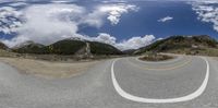 the panoramic shot shows an empty roadway near a mountainous area with a steep hill and blue sky