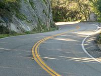 A rural road winds through the mountains, surrounded by beautiful natural landscape. The asphalt road curves along a rock wall, creating an S-curve that adds depth to the scene.