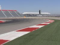 This is an image of a race track and runway surrounded by a clear sky. The asphalt road curves around the grassy area, leading to the grandstand and stadium for spectators. The structure and lines create a fixed link for the racing and aviation activities taking place here. The image also shows an airplane on the runway, ready for takeoff. This photograph captures the excitement and energy of racing events, as well as the precision and speed of aviation. It represents a perfect day for outdoor activities and sports enthusiasts.