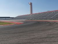 An asphalt road winding through a clear sky. The fixed link structure leads to a race track lined with grandstands. Race cars speed around the curve, captivating the stadium crowd.