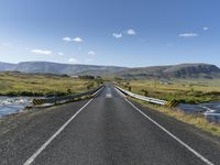 An asphalt road winding through the stunning landscape of Iceland. The road leads straight down, offering a magnificent POV. Clear skies, mountains, and a river add to the natural beauty. Armco barriers ensure safe passage on this European island.