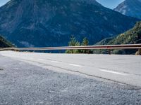 An asphalt road winds through the stunning mountain landscape of Italy. The clear blue sky is dotted with fluffy white clouds, while the tranquil body of water adds to the breathtaking view. The road is lined with an Armco barrier for safety.