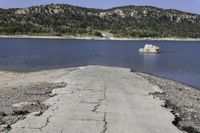 A picturesque coastal scene with an asphalt road leading straight towards the lake. Lining the shore are stunning trees, adding to the natural beauty of the landscape. A clear sky completes this rugged coastal day.