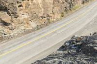 Top down view of an asphalt road winding through the elevated landscape of British Columbia. The road surface follows the contours of the mountain terrain, with rock walls and slopes on either side. Nature and vegetation formations add to the scenic beauty of Lillooet.