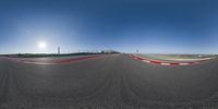A 360-degree view of an asphalt road stretching into the horizon. The landscape is a plain field bathed in sunlight. The road surface shows a slight motion blur, hinting at high-speed travel. A perfect day for a road trip.