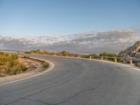 Asphalt road winding through Majorca at dawn. Armco barrier follows the curve, leading to a break of day. Clouds scatter the sky over the Balearic Islands in Europe.