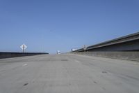 A view from a car driving down a straight asphalt road. The white lines on the road surface create a sense of motion blur. Street lights line the thoroughfare as it stretches into the horizon.