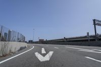 A straight stretch of asphalt road with motion blur as vehicles zoom by. Lined with poles and curbs, this highway showcases the infrastructure of a bustling thoroughfare. Clear skies above add to the sense of endless travel.