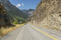 A straight asphalt road leads through the mountainous landscape of British Columbia, Canada. The road surface winds between rock walls and lush vegetation. Clear skies and a distant highland add to the natural beauty of the scene in Lillooet.