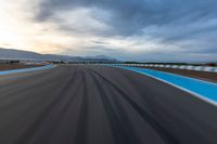 Straight down the road on a sunny morning in the USA. Asphalt curves ahead, revealing a race track bathed in the golden light of dawn. Sun visible in the clear sky adds to the excitement of racing.