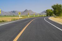 A scenic road in rural Thailand, surrounded by lush green fields and towering mountains. The asphalt road winds through the landscape, curving gracefully around the rugged terrain. Clear skies and vibrant yellow grass make for a picturesque day.