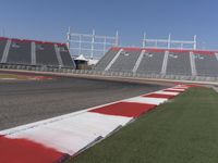 This image showcases a road curving through an open field with lush green grass. The asphalt road provides a clear path for automobiles, leading towards a line of fixed structures in the distance. The clear sky overhead adds a sense of openness and freedom to the scene. The field is surrounded by vegetation, including a race track and an arena with a grandstand. This photo captures the energy and excitement of racing events held in this outdoor stadium. It is the perfect representation of a beautiful day at the race track.
