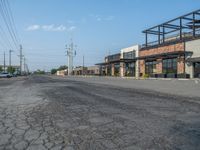 the empty street outside of the business district is empty and deserted with vehicles parked in it