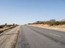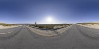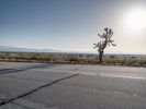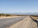 A straight asphalt road in Los Angeles, California, showcases a clear sky with distant mountains. The landscape reveals the desert’s beauty under the day's bright sun. A typical drive through a scenic Californian profile.