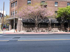 A sunny day in Los Angeles, California, showcasing asphalt roads, classic architecture, and bustling urban storefronts. Clear skies illuminate the city's profile, offering a glimpse into its vibrant street life.