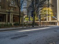 two benches on the side of a street in front of some tall buildings and buildings
