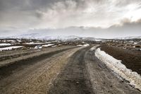 This image captures the vast and diverse landscape of Australia. The photo shows a long and endless road stretching through the desert. The road surface transitions from asphalt to dirt and gravel, reflecting the off-road nature of the area. Surrounding the road are majestic mountains and trees, adding to the beauty of the scenery. The winter atmosphere is evident with the presence of snow on the ground. The cloudy sky hints at the wet and freezing conditions in the area. This photo represents the endless possibilities and adventures that await on the roads of Australia.