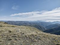 A breathtaking view of the Australian highlands at Mount Hotham. The rugged terrain and open grassy slopes add to the beauty of the landscape. Contrails streak across the clear blue sky above the mountain range and valley.