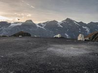 An open space campsite in Austria at dawn, with the majestic mountains in the background. The black and white photo captures the serene beauty of the European landscape.