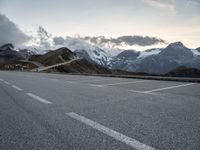 a lone road leads up to a mountain with snow covered mountains in the background and mountains