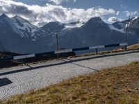 A winding road in Austria, surrounded by stunning European mountain landscape. Clear skies overhead enhance the natural beauty. The road is lined with cobblestones and Armco barriers, ensuring safety while enjoying the scenic drive.