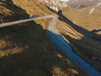 A picturesque landscape in Austria featuring an elevated road winding through the majestic mountains. Clear skies highlight the lush green grass and vibrant woodland. The road's switchback and S-curve provide a thrilling driving experience.
