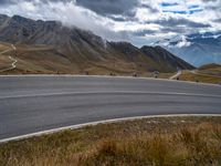 a curved road near many mountains on a cloudy day with clouds in the sky and people walking on the sidewalks