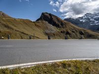 A picturesque landscape in Austria, featuring a winding road that curves through the highlands. The road is surrounded by lush green grass and vegetation, with a clear sky and mountains in the background. A serene lake reflects the beauty of the surrounding nature.