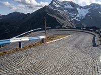 A picturesque landscape in Austria, featuring a curving road that cuts through the highlands. The road surface is made of cobblestones and is lined with guard rails and Armco barriers. The clear sky reveals stunning mountain views and a serene lake.