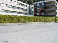 This is an image of a modern architecture building in Europe. The landscape features a mountain in the background and a parking lot with asphalt surface in the foreground. Next to the building, a couple of bushes are visible. This photo represents a typical day in Europe, where architecture and nature coexist harmoniously.