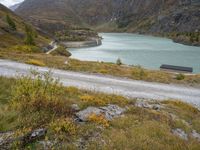 this is an image of a view of the mountains, lake and a roadway in the foreground