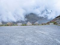 This is a packshot image of a motorcycle sitting in a gravel lot on a mountain side in Austria, Europe. The gloomy and misty atmosphere is reflected in the grey sky above. The open space and rugged landscape highlight the natural beauty of the location. The dirt surface and gravel add texture to the scene. This photo captures a day in the mountains, showcasing the serene and peaceful nature of the surroundings.