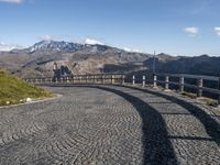 A winding stone road in the mountains of Austria, with stunning European landscape in the background. Clear skies and sunny weather showcase the natural beauty of this road. Armco barriers and guard rails ensure safety along the way.