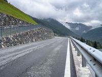 A picturesque road in Austria winding through the countryside, flanked by majestic mountains. The gloomy grey skies add a touch of mystery to the landscape. Armco barriers and guard rails provide safety alongside the road.