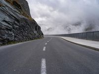 This image captures the dramatic landscape of a narrow road in Austria, Europe. The road winds through highlands and mountains, with cliffs and fog creating a dangerous and mysterious atmosphere. The grey road surface and Armco barriers provide necessary infrastructure for safe travel in this treacherous area. The mist and fog add an element of drama to the scene, making it an intriguing and captivating view of nature. This photo represents the breathtaking beauty and challenging terrain of Austrian landscapes.
