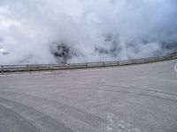 This image showcases the breathtaking landscape of Austria, Europe. The open space and mountains provide a stunning backdrop to the road and asphalt as a car travels along. The clouds overhead create a dramatic effect, with smoke billowing out of them. The scene features guard rails and parking lots, highlighting the infrastructure and facilities available in this area. The Armco barrier adds to the overall composition, providing a sense of safety and security. This photograph represents a beautiful day in Austria, capturing the natural beauty of the country.