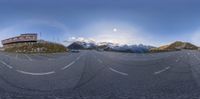 a wide angle panoramic view of a highway near snow capped mountains and a red building