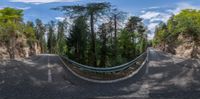 a wide angle photo shows an empty road with trees on both sides of the street