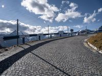 A scenic road in Austria, meandering through breathtaking mountain landscapes. Clear skies enhance the natural beauty. Cobblestone road with Armco barriers and guard rails ensures a safe journey. Explore the beauty of Europe's nature.