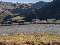 a blue and white train driving along a track in the middle of mountains near a gravel road