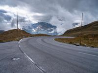 an asphalt road stretches into the distance with mountains in the background on a cloudy day