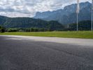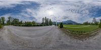Panoramic view of a road winding through the Austrian highlands, surrounded by majestic mountains. Clear skies and lush vegetation create a picturesque landscape. The road surface shines under the bright sunlight, reflecting the city life nearby. An oval lens adds a unique perspective to this urban design.