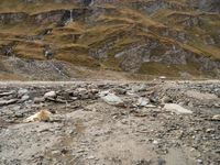 This stock photo features a stunning Austrian landscape, showcasing a dry and rocky ground surrounded by majestic mountains. The clear sky above adds to the breathtaking view. The rugged terrain and open space create a sense of adventure, perfect for off-road enthusiasts. Clouds cover the mountain peaks, while others drift in between, creating a dynamic and ever-changing scene. The image captures the beauty of nature, with its dirt and gravel surface, making it ideal for showcasing the rugged beauty of the Austrian outdoors. The photo can be used to represent the natural landscapes of Europe and its stunning mountain ranges, as well as the concept of exploration and adventure on rugged tracks and trails.