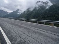 A road in Austria winding through the picturesque European landscape. The asphalt meanders along the mountainous terrain, guarded by Armco barriers and railings. The gloomy grey sky adds a touch of drama to the scene.